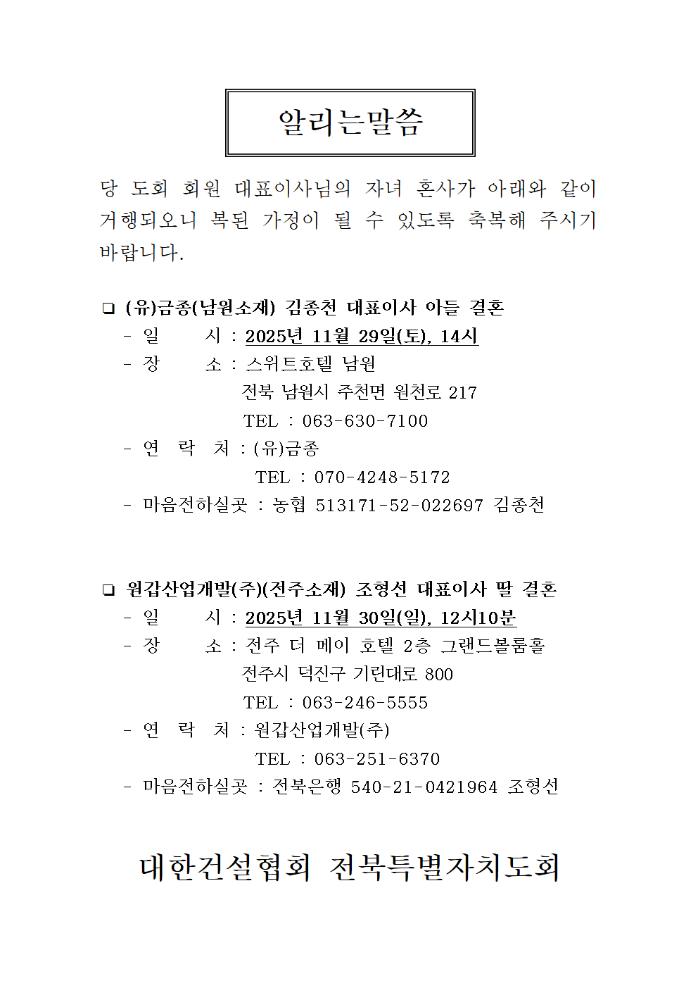 [2025.12.07] (유)원탑종합건설 이재선 대표 딸 결혼 / 정록토건(주) 김영우 대표 딸 결혼